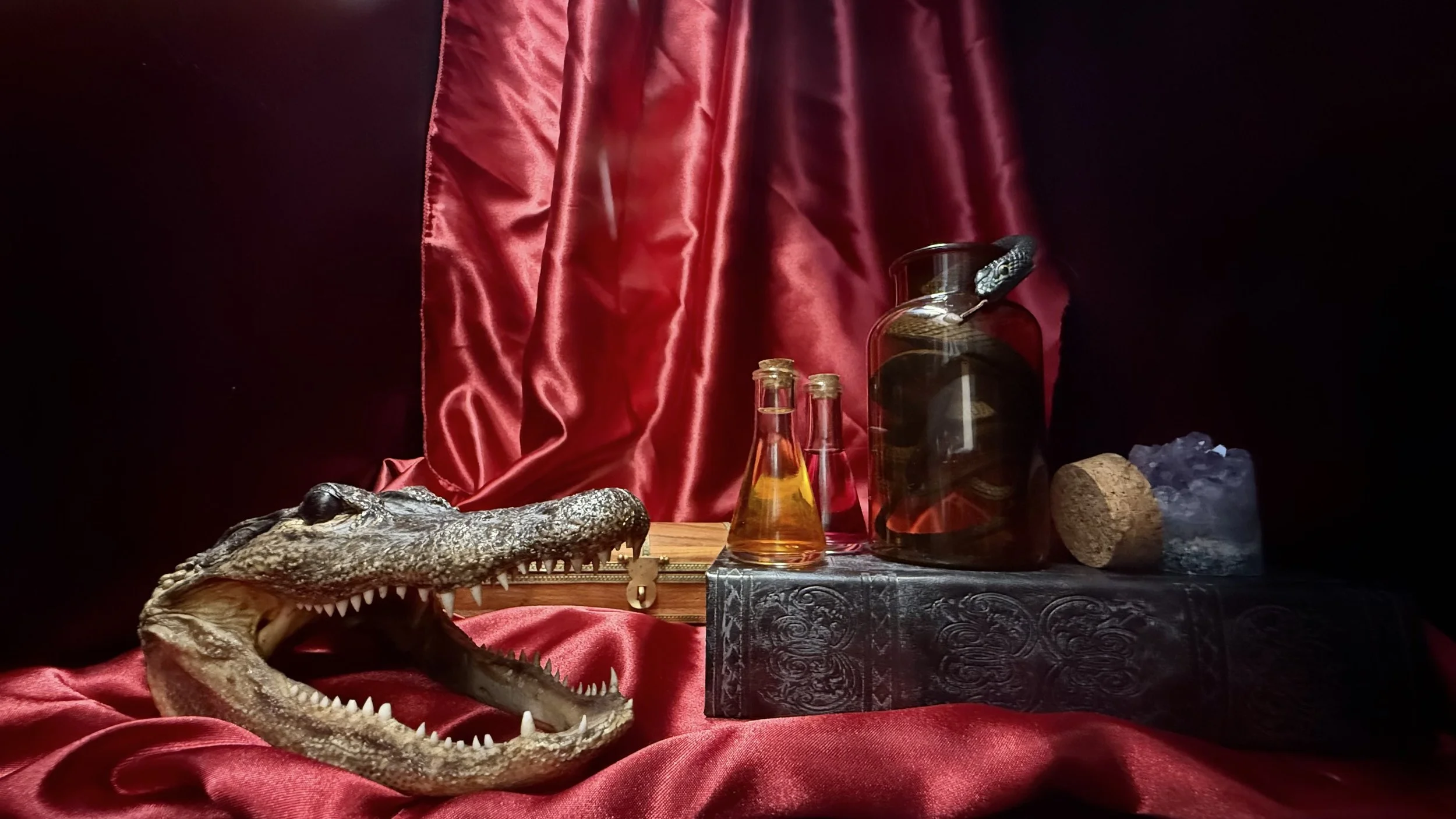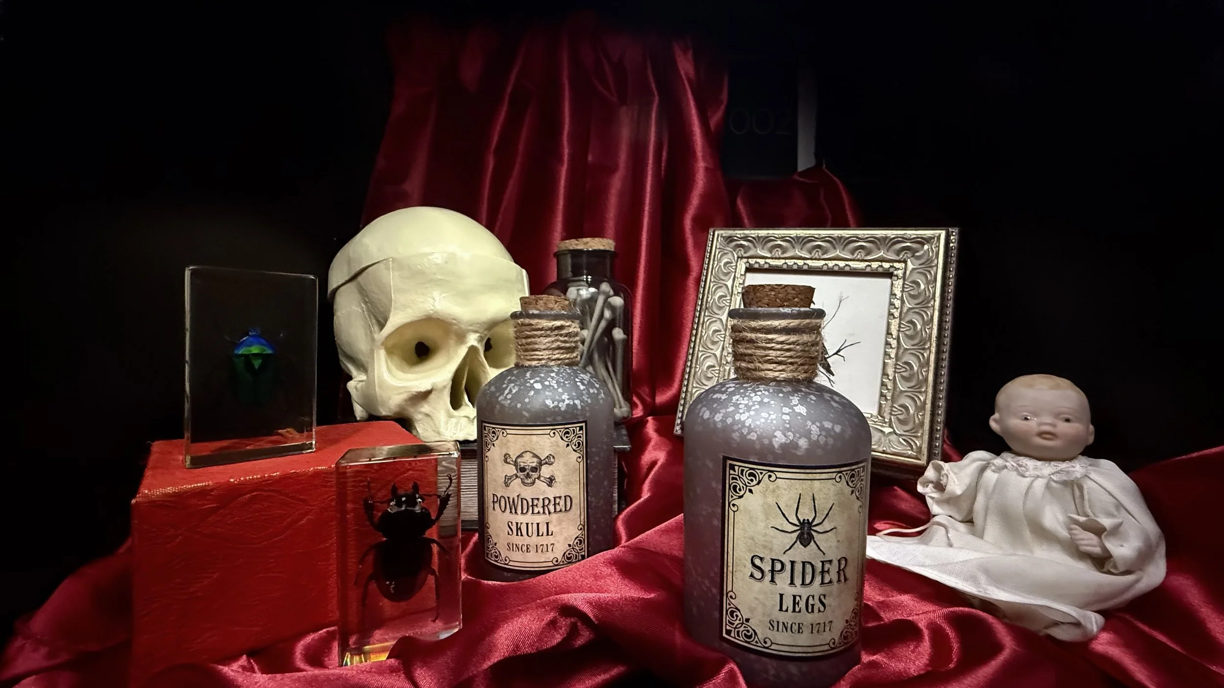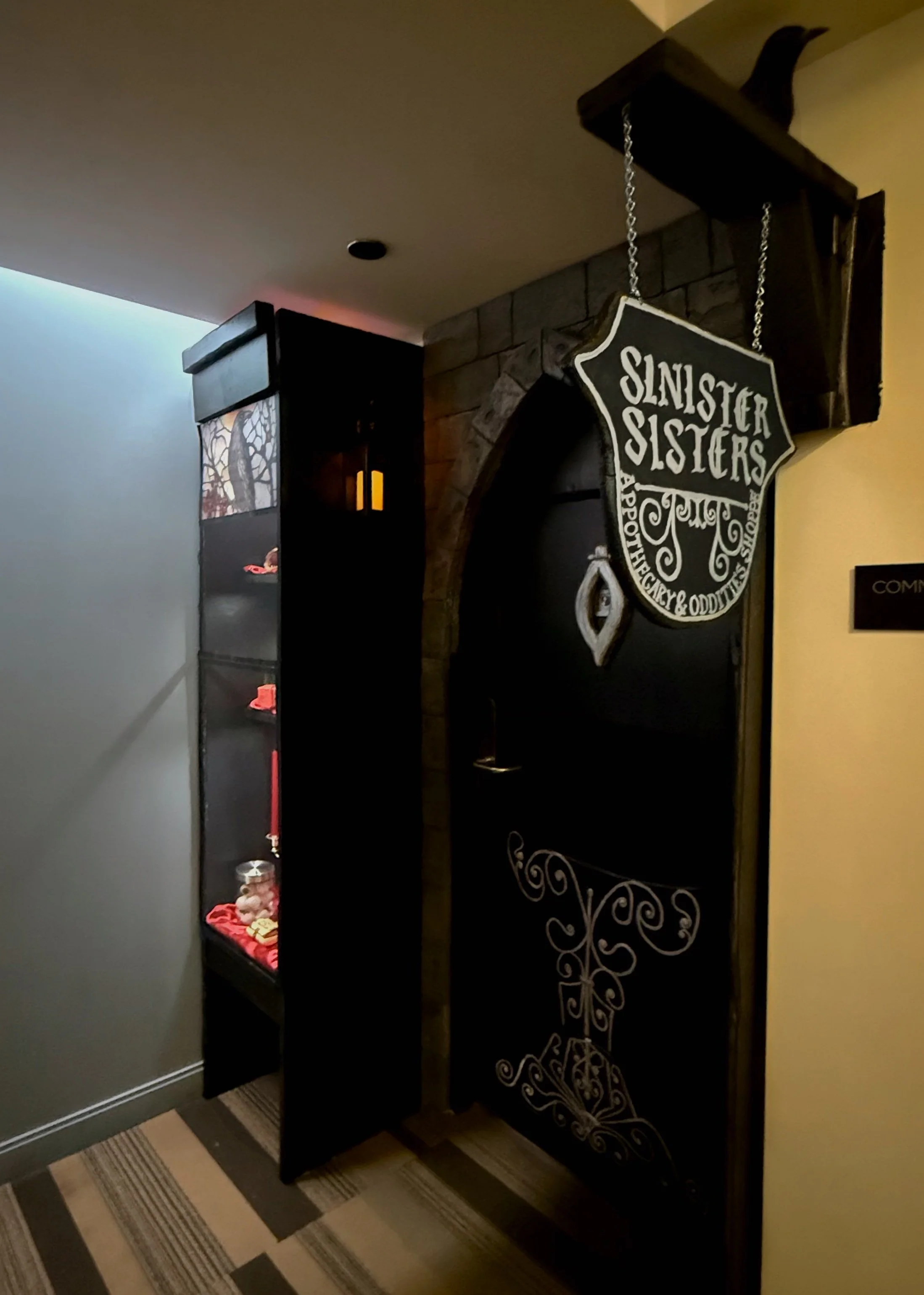 The window display frame, stone wall, and shop sign are made from painted foam board. The curtain is hand-sewn from recycled fabric, and the shop window is plexiglass with static-cling window film cut to fit.